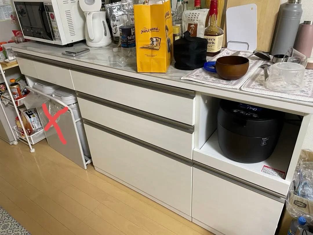 - 組み立ては男性1人だと、2時間くらいかかり、とても辛かったそうです。 家具を複数組み立ててもらいましたが、一番辛かったとのこと。 説明書を読んでも使い道のわからない板があったり……。 ゴムハンマーのご用意を強くオススメします。 見た目はたいへん可愛くきれいで、客人からもいつも大好評です! 炊飯器のスライドもつっかかり無く引け、ちゃんと留まります。 引き出し収納はワイン2本程度の重いものを入れるだけで途端に引き出しにくくなります。ガッガッ。 前後左右、全体の重さを調整してあげないとダメなようです。